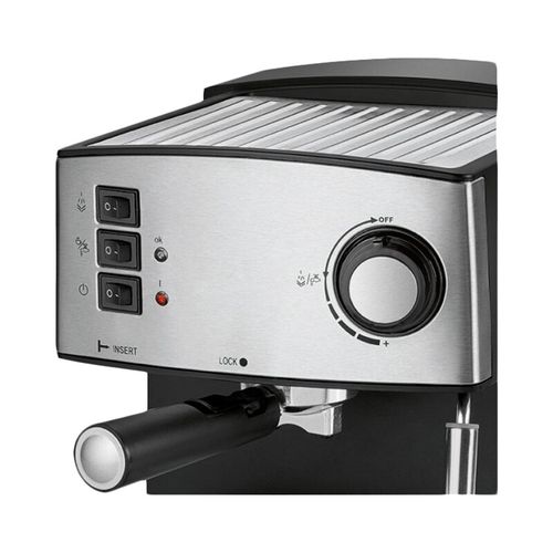 Machine à espresso/capuccino à pompe. Face en acier inoxydable.Buse à vapeur pivotante en acier inox. avec fonction mousse et eau chaude.Volume de vapeur réglable progressivement. Embout de la buse de vapeur amovible pour faciliter le nettoyage.Fonction de chauffage de tasse avec encastrement aluminium.Pression de pompe constante à 15 bar. Réservoir d'eau de 1.6L (amovible).Indicateur externe du niveau de l'eau.Coupelle de récupération avec grille à gouttes en aluminium (amovible). 2 témoins lumineux.S´éteint automatiquement.Indication du statut opérationnel. Accessoires 2 supports de filtre (pour 1 ou 2 tasses). cuillères à café. presse mouture.230 V. 50 Hz. 850 W