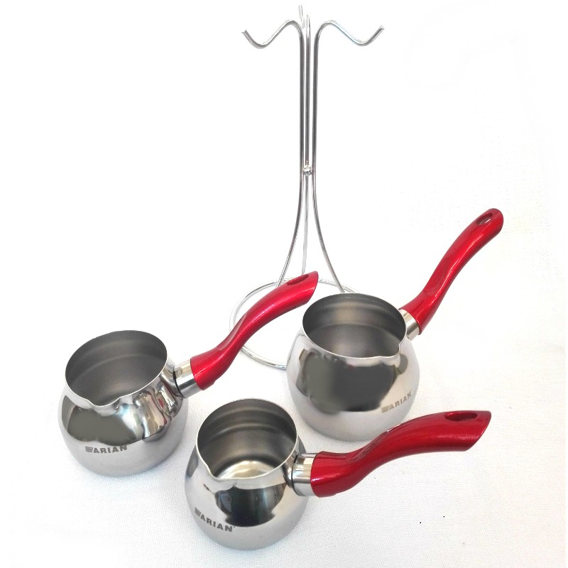 Série De 3 Pot De Café Turc Zazwa Avec support En Inox 18/10-ANEMON pour Préparez un délicieux café dans instant ne sera plus facile que maintenant grâce à un pot de café turc. Idéal pour la maison ou pour un usage professionnel avec ses différents tailles. Conçus avec un bec verseur pratique pour éviter de perdre aucune goutte.de capacité 170ml pour Préparez deux tasse de café,340ml pour Préparez quatre tasse de café et 680ml pour Préparez huit tasse de café