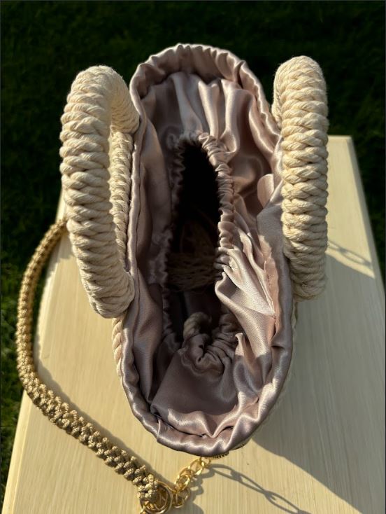 Petit couffin en feuilles de palmier avec décoration en crochet macramé