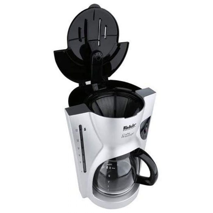 achine A Café FAKIR Prestige - Puissance: 900 watts - Capacité en tasses: 11 Tasses - Capacité du réservoir: 1.5 L - Indicateur de niveau d'eau externe - bouton marche/arrêt avec témoin lumineux - Plaque chauffante avec arrêt automatique - Système anti-goutte et anti-débordement - verseuse en verre - Dimensions: 24 x 23 x 34 cm - Couleur: Silver