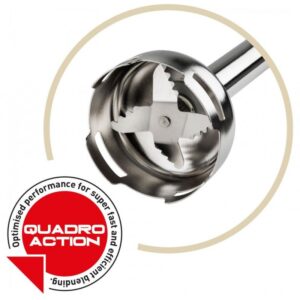 Que ce soit pour mélanger, réduire en purée, battre ou hacher – avec le blender Mr Chef Quadro de Fakir à l’avenir, tout fonctionnera parfaitement. Grâce à ses accessoires polyvalents et de haute qualité, le mixeur combine toutes les fonctions dans une seule machine. La semelle antidérapante pratique de l’ensemble blender l’empêche de tomber et reste toujours stable pendant le fonctionnement. Le mixeur plongeant s’enclenche facilement et est immédiatement prêt à l’emploi. Le mixeur plongeant 4en1 se compose d’un hachoir (capacité 1,5 l), d’un gobelet mélangeur et doseur (capacité 900 ml), de 2 fouets en acier inoxydable et d’un mixeur en acier inoxydable. Le broyeur a plusieurs accessoires pour râper, raboter et déchiqueter les aliments. Notre Mr Chef Quadro tient également confortablement dans votre main grâce à sa forme ergonomique. Vous pouvez même produire de la glace pilée avec les couteaux en acier inoxydable à 4 ailes dans le bol du mélangeur. Préparer le pesto, les soupes, les aliments pour bébés, les trempettes et le beurre aux herbes: tout cela n’est plus un problème avec notre mixeur à main Mr Chef Quadro.