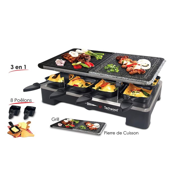 Nom : Raclette-Grill-Plancha-Pierre de Cuisson, 1400 W, Inclus : 8 poêlons,